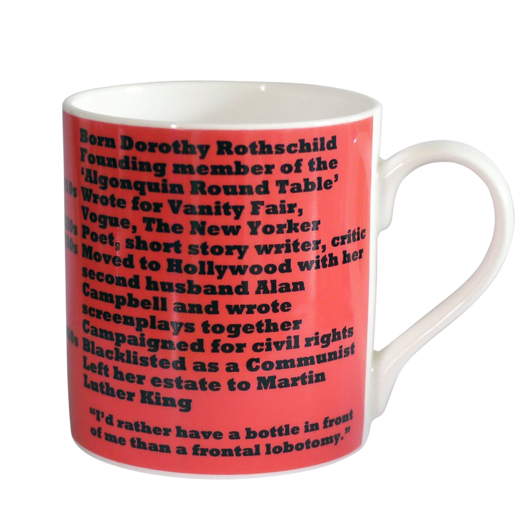 A really good quality bone china mug featuring Sarah Cole's distinctive drawing of Dorothy Parker, together with dates and facts to help you mug up with your cuppa.